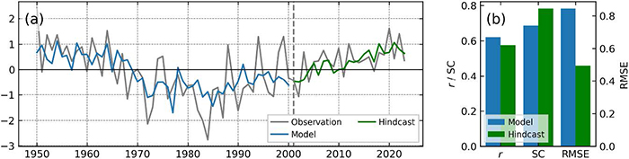 图3. (a) SSR指数时间序列(灰色线)、建模阶段模型结果(蓝色线,1950-2001年)及独立后报结果(绿色线,2002-2023年)。(b) 建模阶段模型(蓝色柱)与后报(绿色柱)的性能评估指标对比,包括相关系数(r)、均方根误差(RMSE)及符号一致率(SC)。